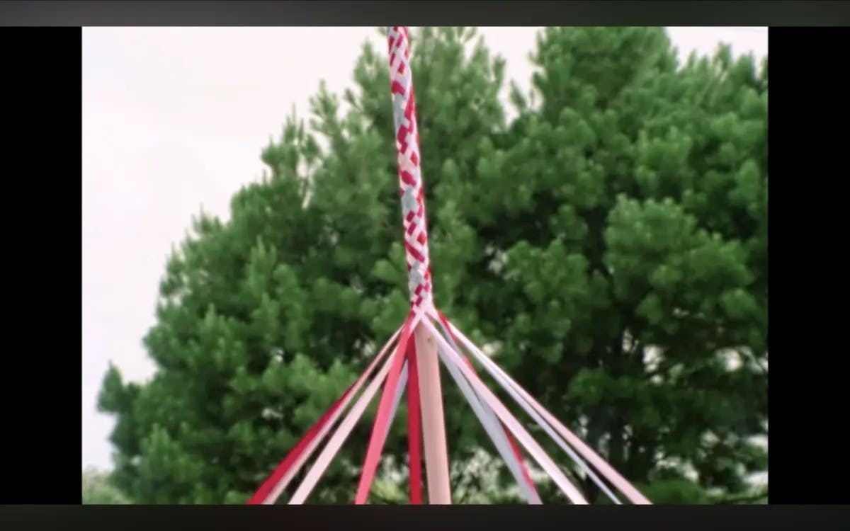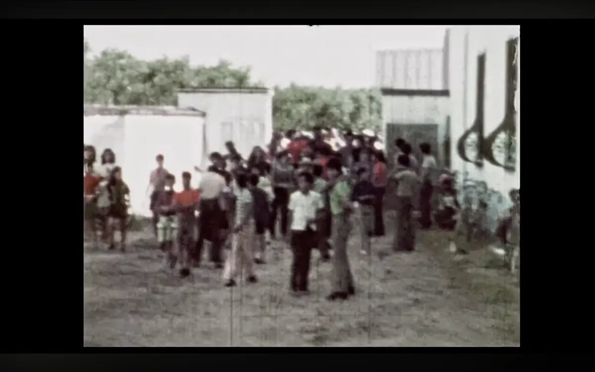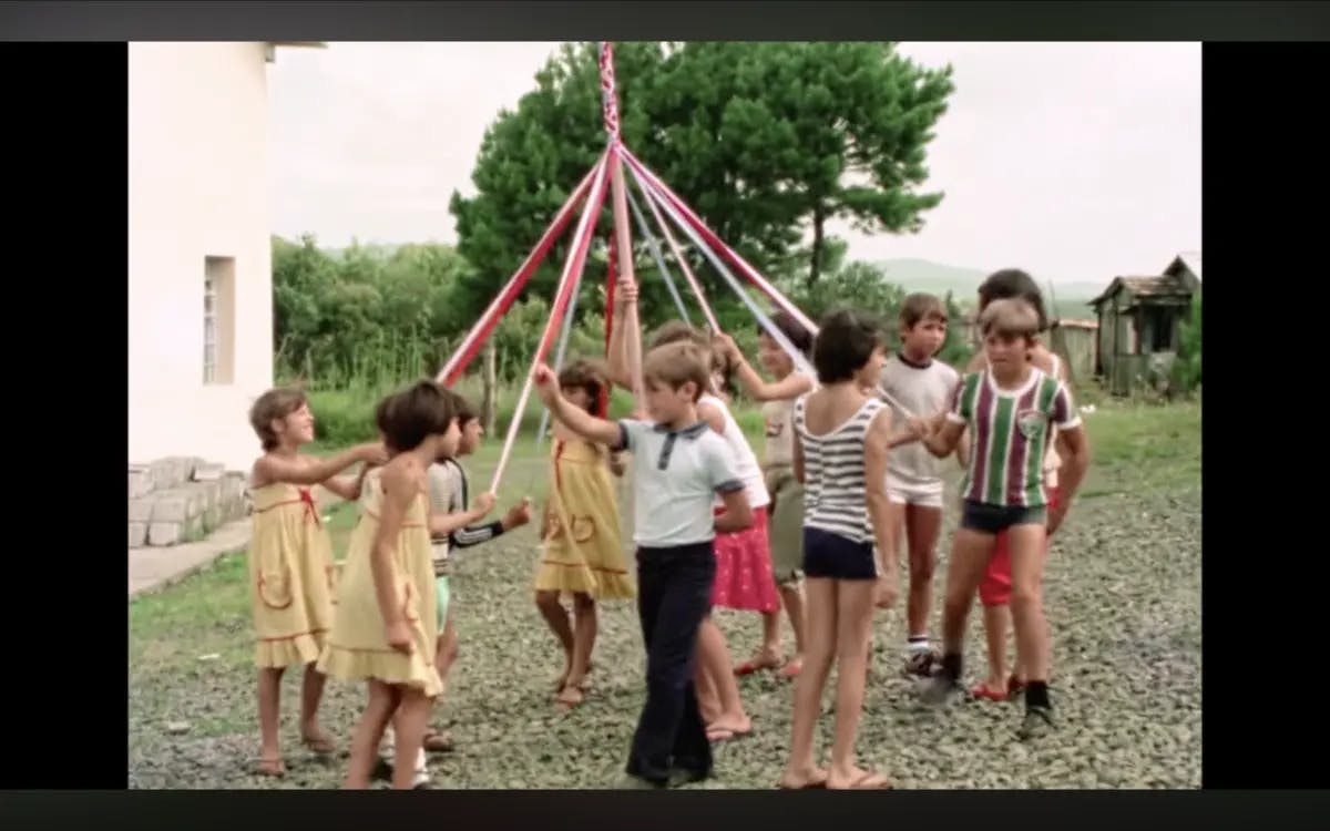 Crianças brincam num terreno de chão de pedras. Em círculo, segurando fitas coloridas de cetim, elas giram em torno de um cabo de madeira, com o qual ensaiam uma dança que em breve virá. O corte da montagem nos direciona à próxima imagem: o grupo segue dando voltas, agora em cima de um palco, tramando o colorido, grafando, com pés e mãos, uma dança tradicional do sul do Brasil. Se, na sequência anterior, a árvore opulenta reverbera o entrelaçar azul-rosa-vermelho dos fios de tecido, com suas ramificações que compõem a paisagem rural, é a pequena multidão, ao olhar curiosa para a movimentação no espaço, que amplifica os detalhes de uma celebração vividamente coletiva. O gesto de emaranhar os pedaços, colocar superfícies distintas em contato, por assim dizer, trançar múltiplos que se tornarão um só corpo, nos ajuda a criar uma tradução ou, melhor, um modo singular de nos aproximarmos de Aulas e azeitonas (Tetê Moraes e Aida Ferreira, 1973) e Lages, a força do povo (Tetê Moraes, 1983).